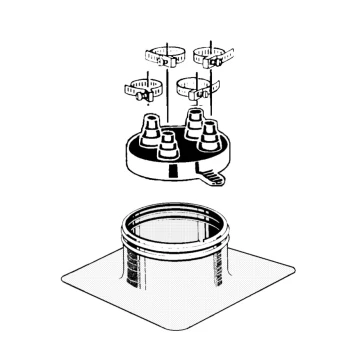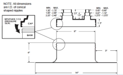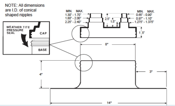 The Plasti-Flash with C-212 Cap is a reliable roof penetration flashing designed to accommodate up to two pipes from 0.375"–1" and two pipes from 1"–2" in diameter. It features a durable .090 PVC base unit with a 4" height and 14" square footprint, a collared opening with dual beaded sealing rings, and a white compression-molded EPDM C-212 cap equipped with stainless steel Snaplock Clamps. The system installs easily following Portals Plus and roofing membrane manufacturer guidelines.