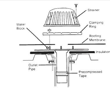 A special precompressed modified asphalt impregnated expanding foam sealing tape automatically makes a permanent elastic watertight seal to the existing drain, eliminating water backup. The flange and outlet tube are available in stainless, aluminum, PVC, or high temperature ABS. ReRoof Drains are available to fit 2", 3", 4", 5", and 6" drains.