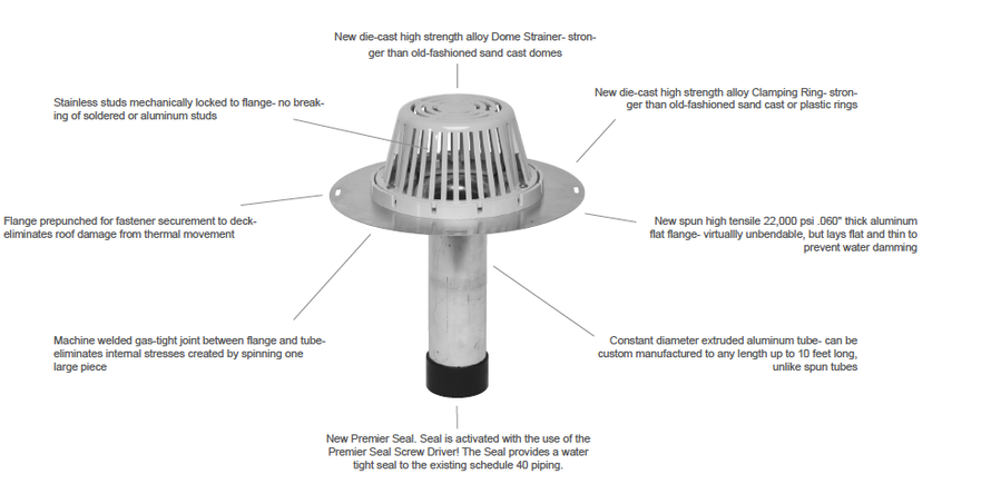 The drain is completely installed on the roof top with NO special tools and all hardware is stainless steel. The unit is available with either plastic or cast aluminum dome strainer and the outlet tube gives minimum downsizing to the existing drain. The Portals Plus ReRoof Drain makes a perfect roofing termination point and offers an excellent connection to the plumbing below.